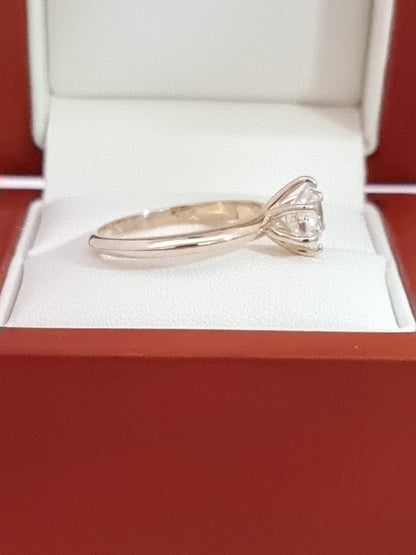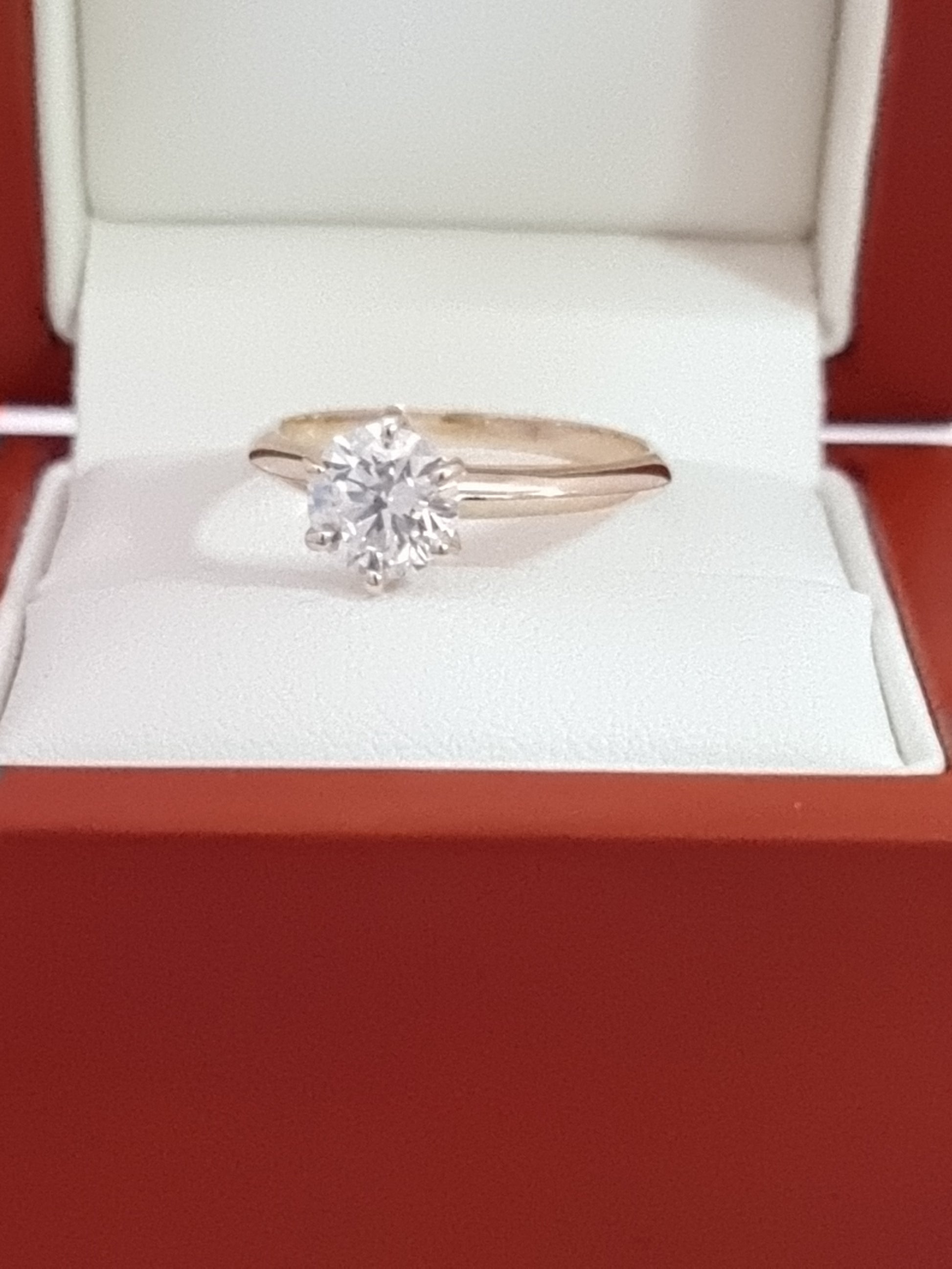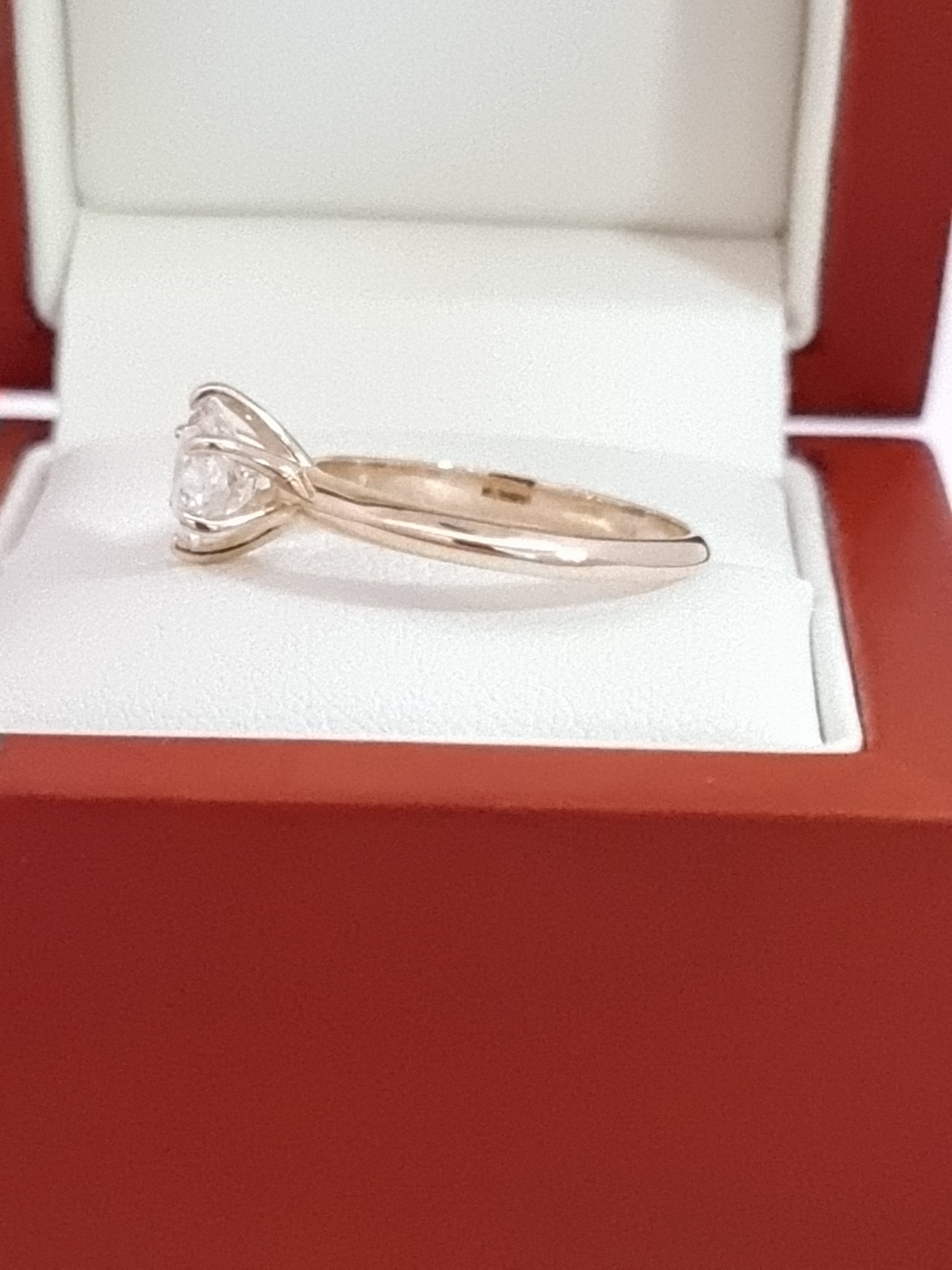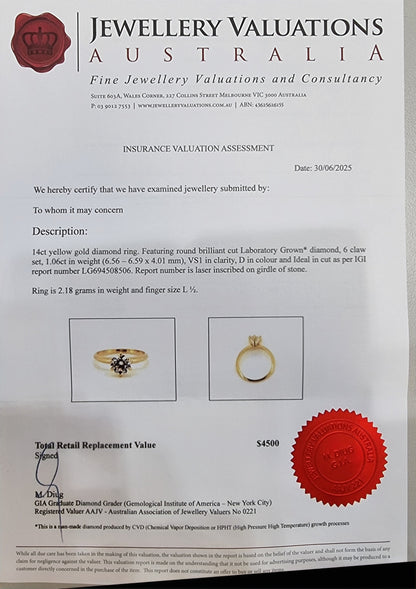 “D” Colour, 1.06 Carat Round Cut Cut Diamond Engagement Ring – 14K YG Size “L1/2”