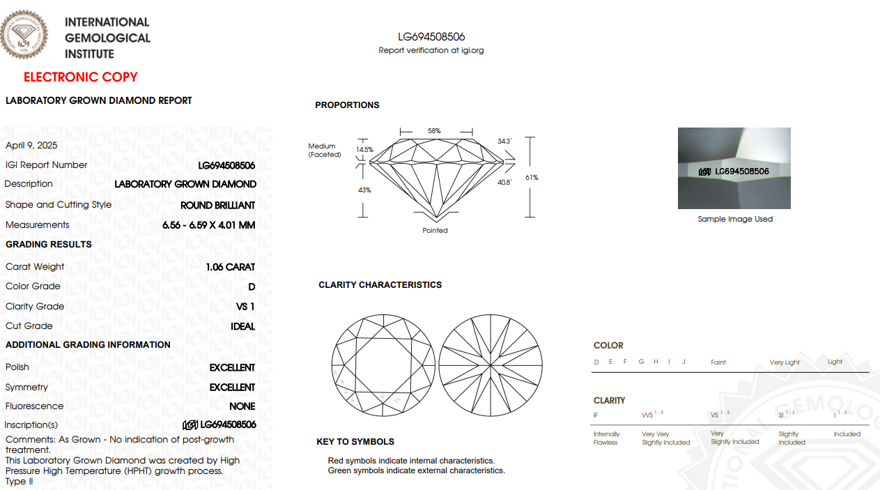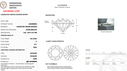 A dazzling “D” Colour & VS1 Clarity (100% Eye Clean), Ideal Cut, Lab Grown Diamond, set in an elegant, solid 14K Yellow Gold setting! IGI Certified and Laser Inscribed for you peace of mind.