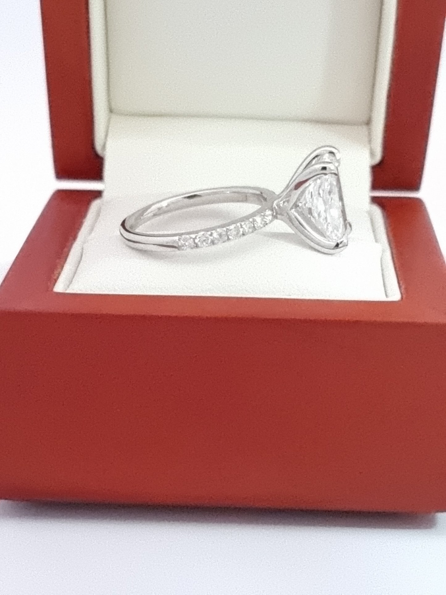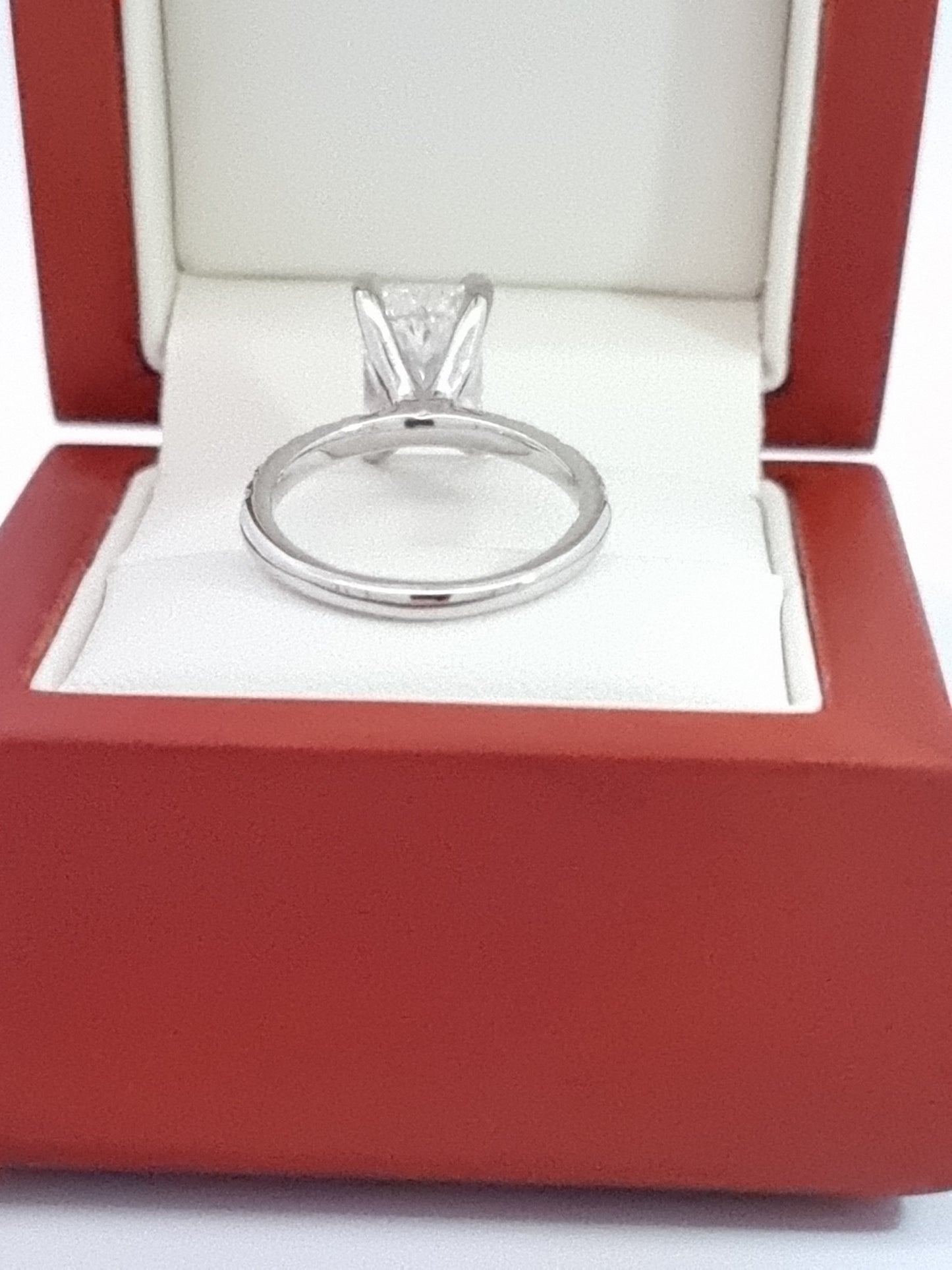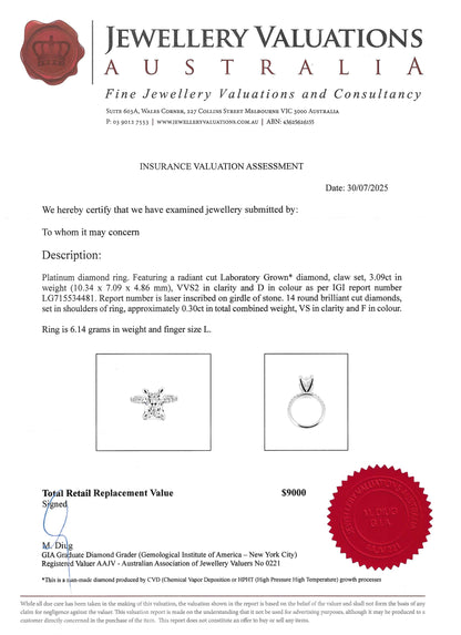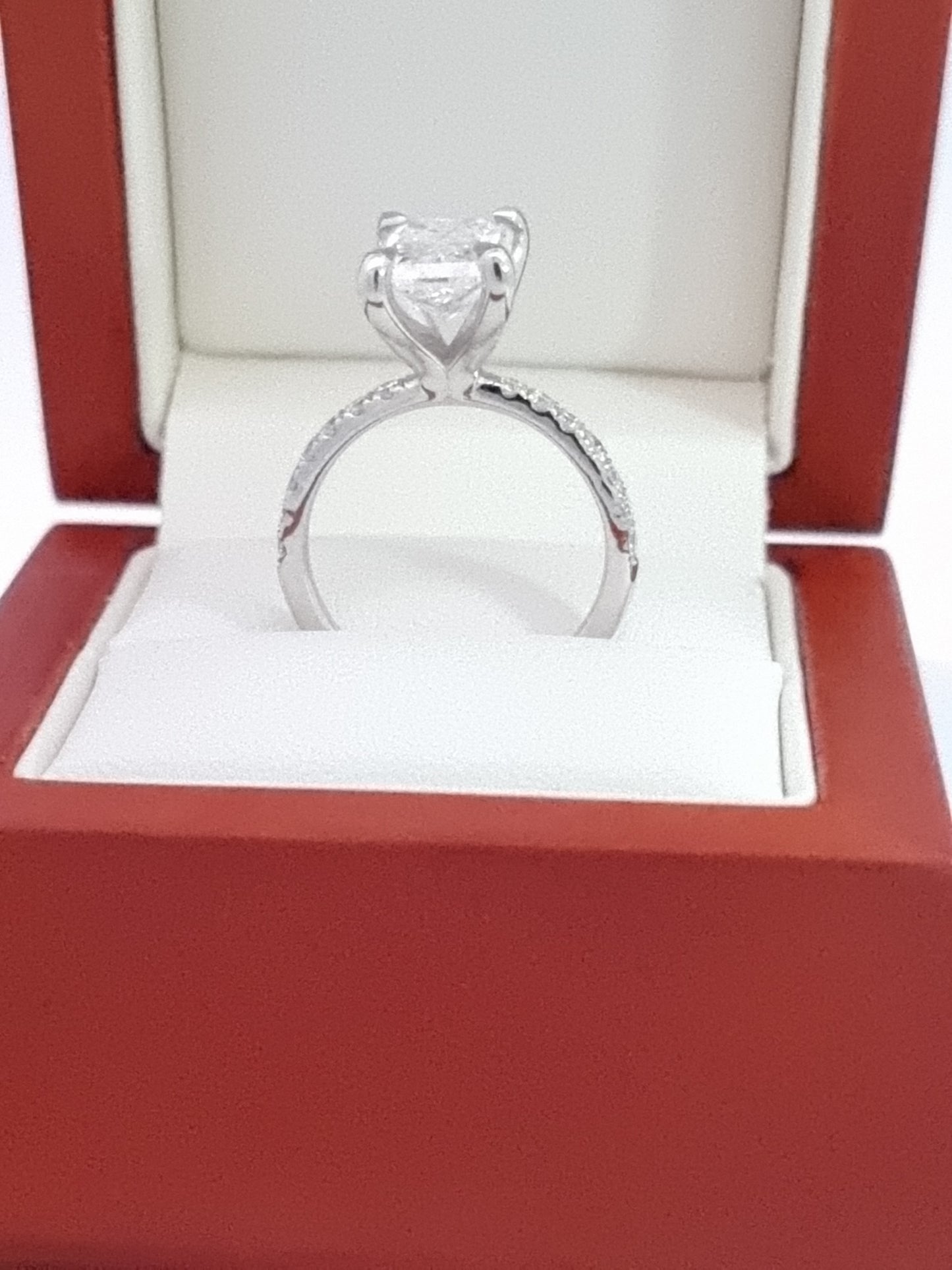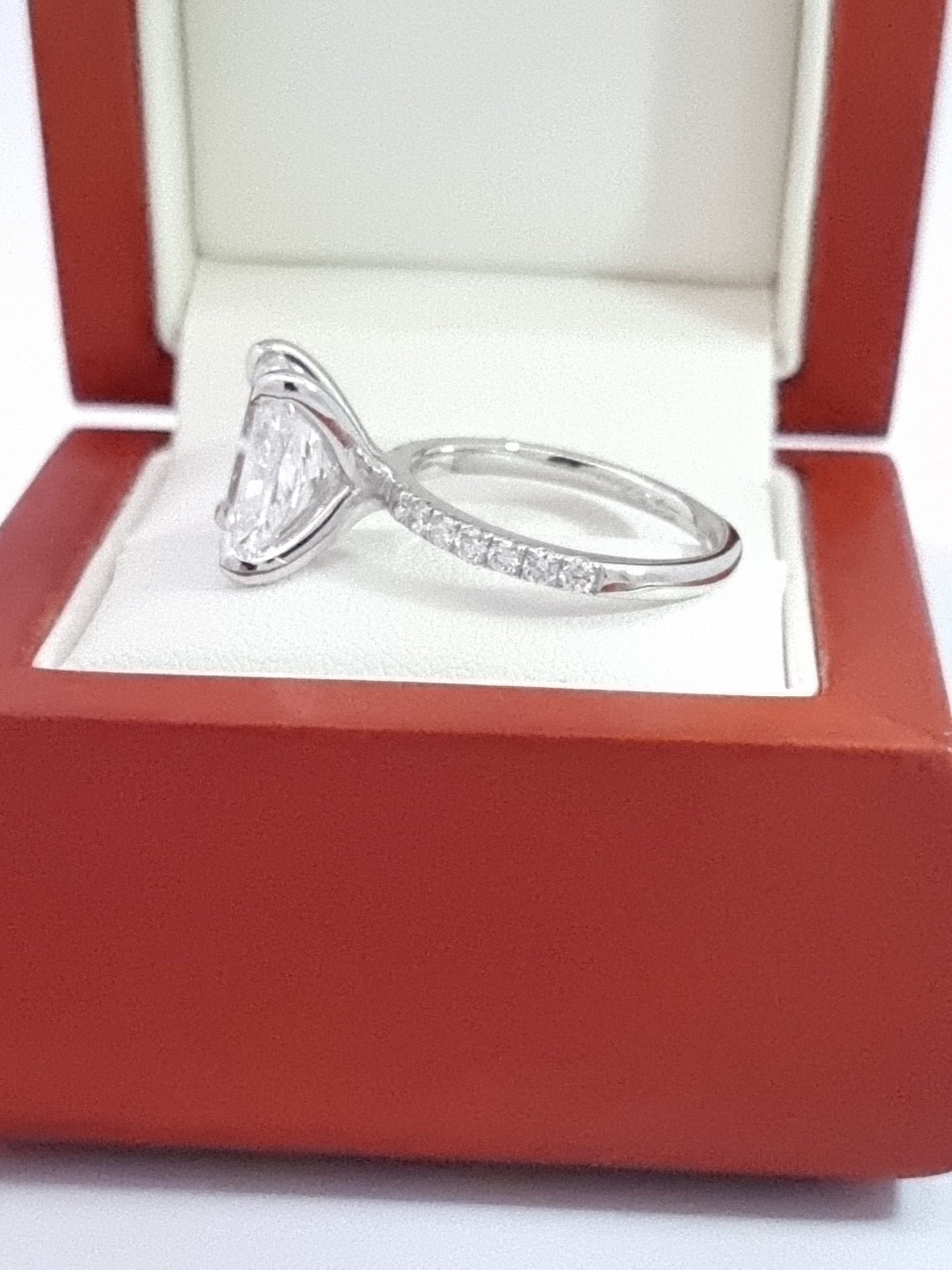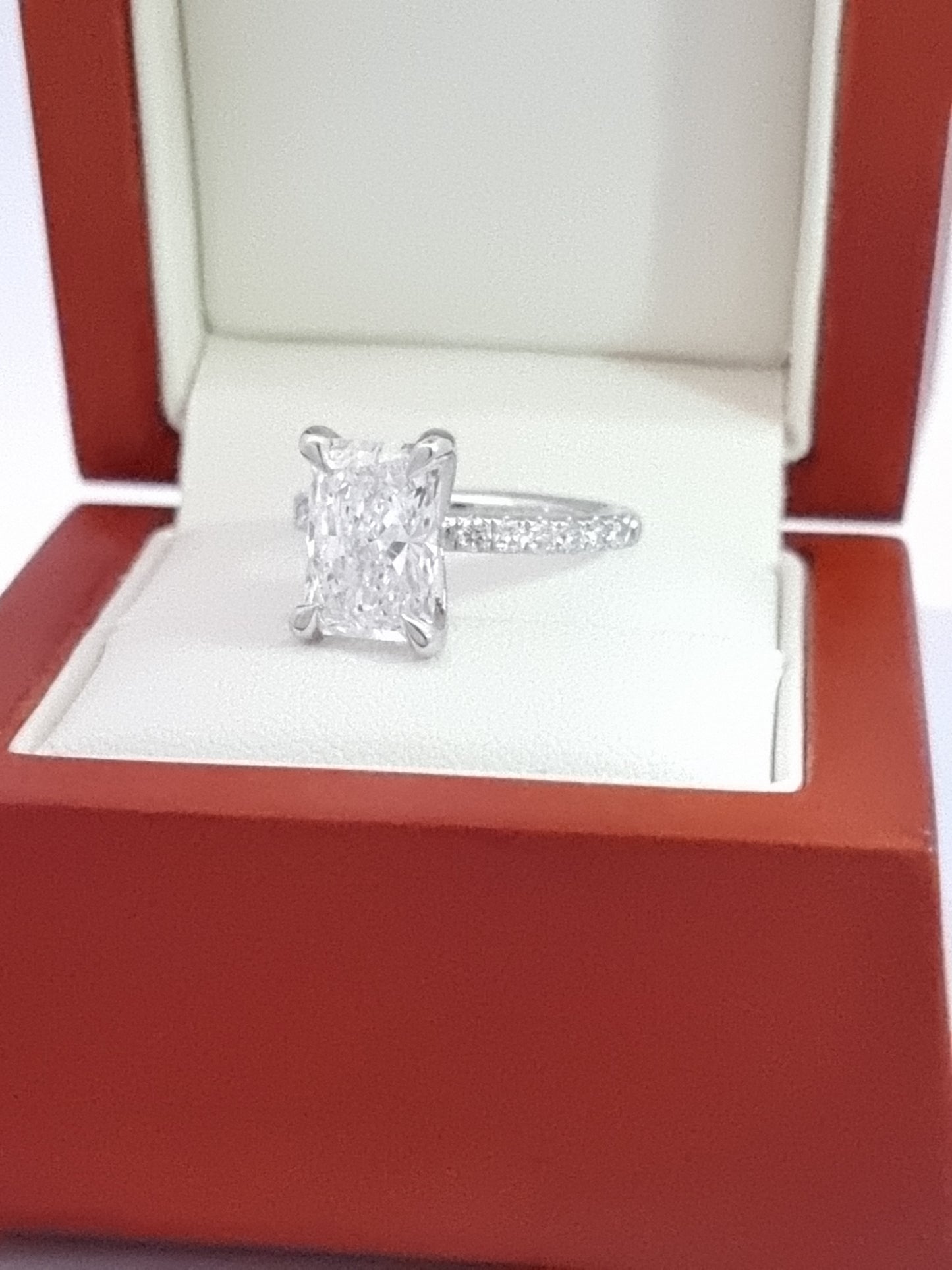 Stunning, “D” Colour (highest colour grade), Radiant Cut Lab Grown Diamond, IGI Certified as VVS2 Clarity (100% Eye Clean). An Ideally Proportioned Diamond in Solid Platinum Setting, with 0.30 High Grade Accent Diamonds. Exceptional Quality – Exceptional Value!