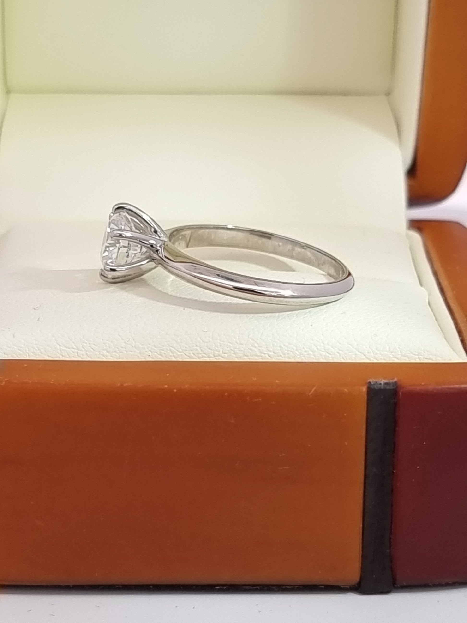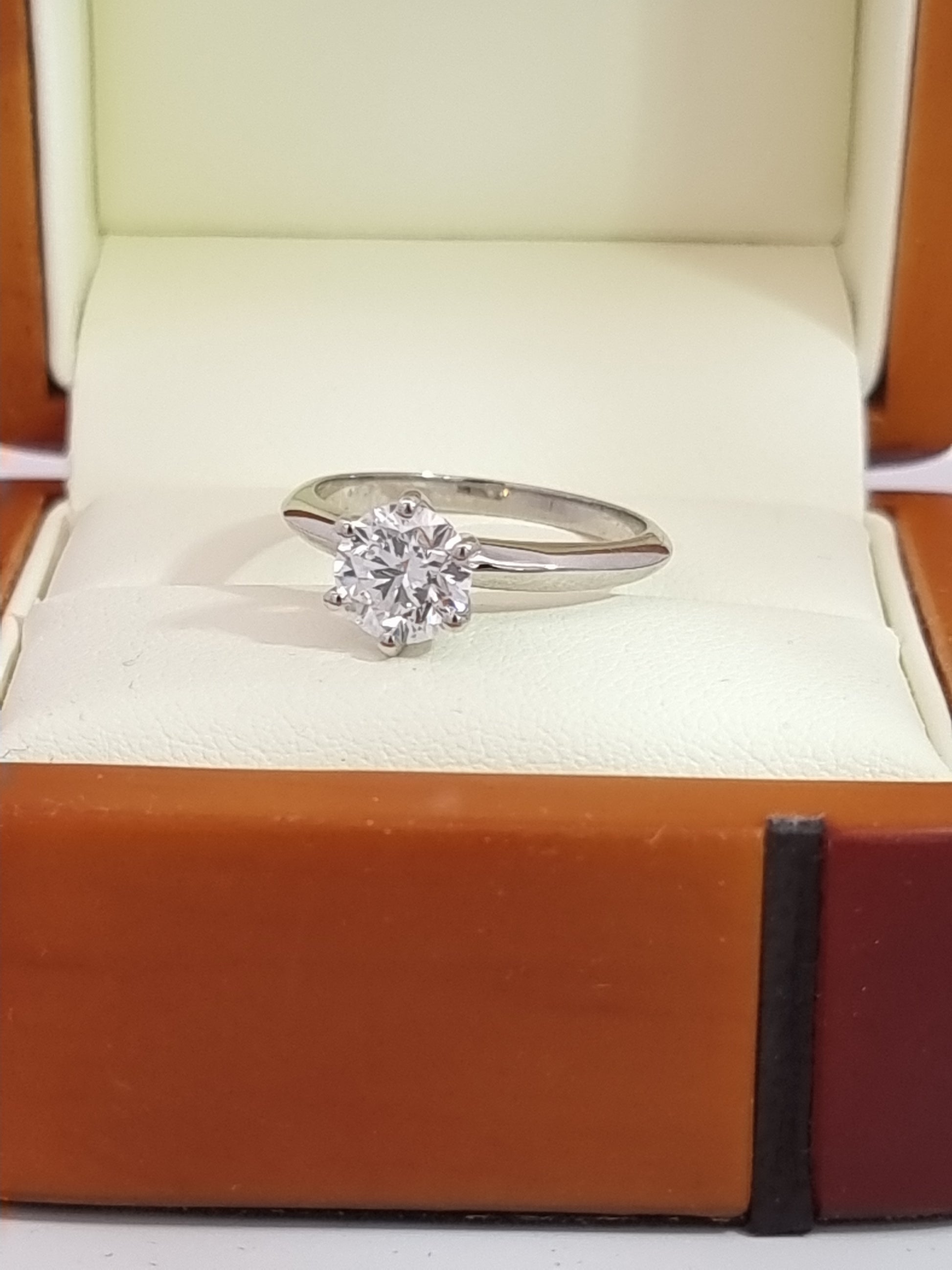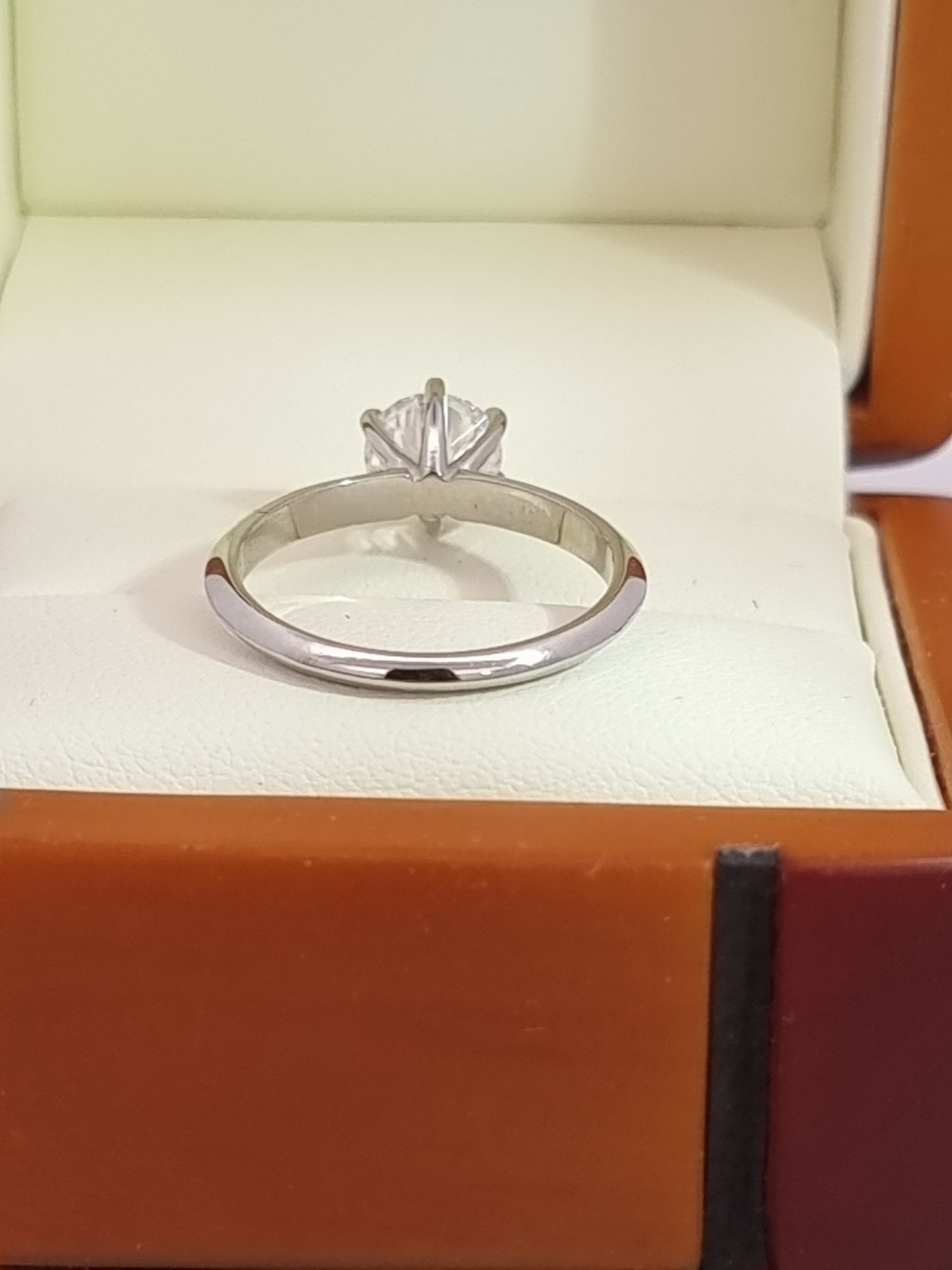 A Stunning “Knife Edge” setting in the style of the world’s most famous engagement ring! Dazzling “D” Colour, Ideal Cut lab grown diamond of 1.10 Carats. 100% Eye Clean!