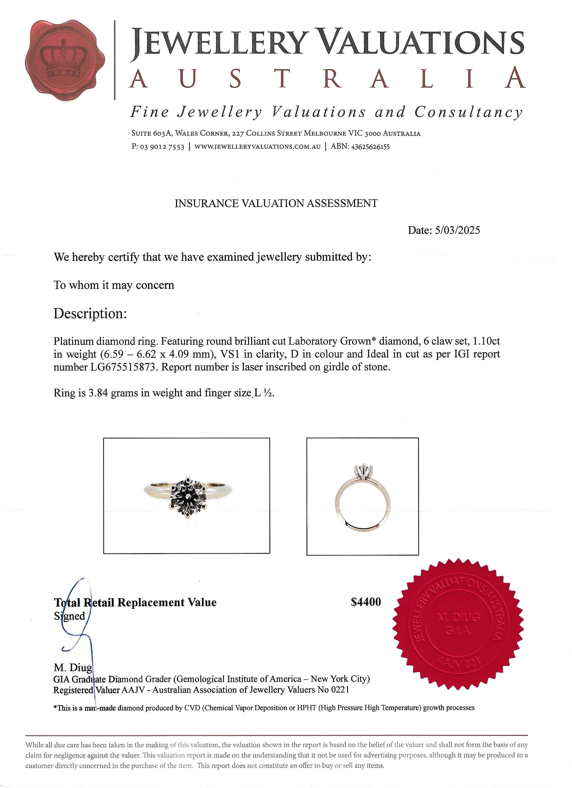 IGI Certified, D Colour, 1.10 Carat Diamond & Platinum Engagement Ring – Save $2000!